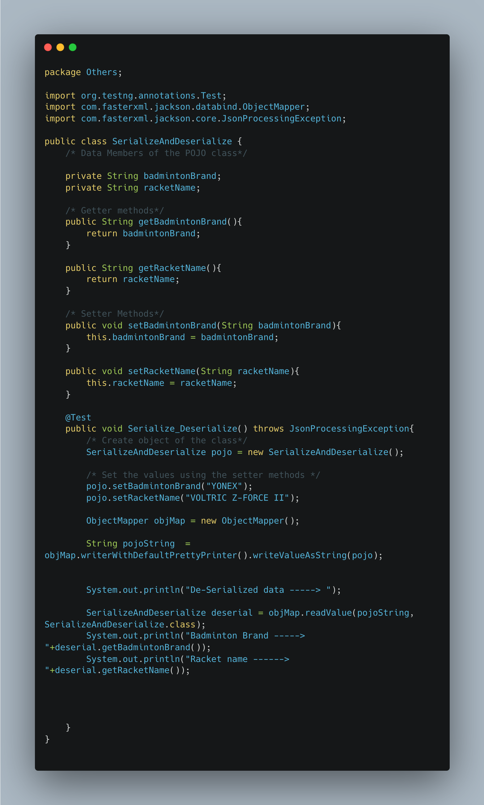 From the example above, let’s implement the getter and setter methods and then try to print the Serialized data